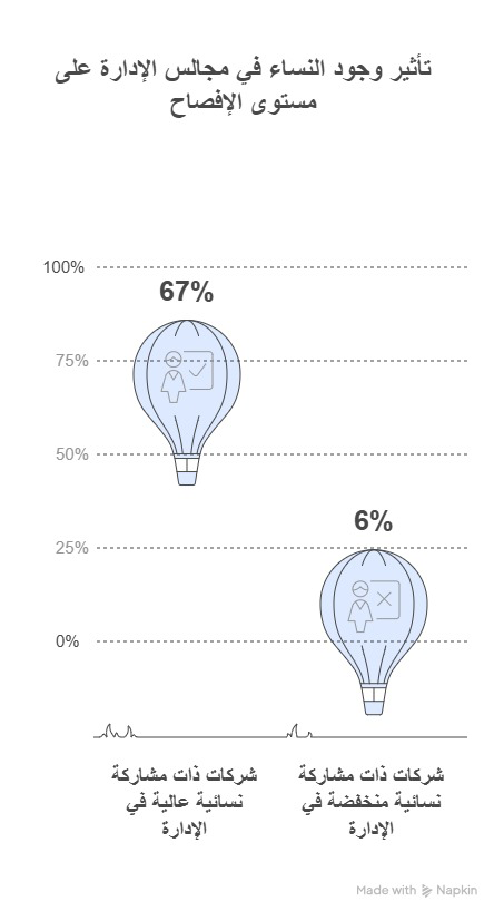 1- الشركات التي تضم نساء في مجالس إدارتها سجّلت مستوى إفصاح أعلى بعشر مرات من الشركات التي تغيب عنها النساء: 67% مقابل 6% فقط.